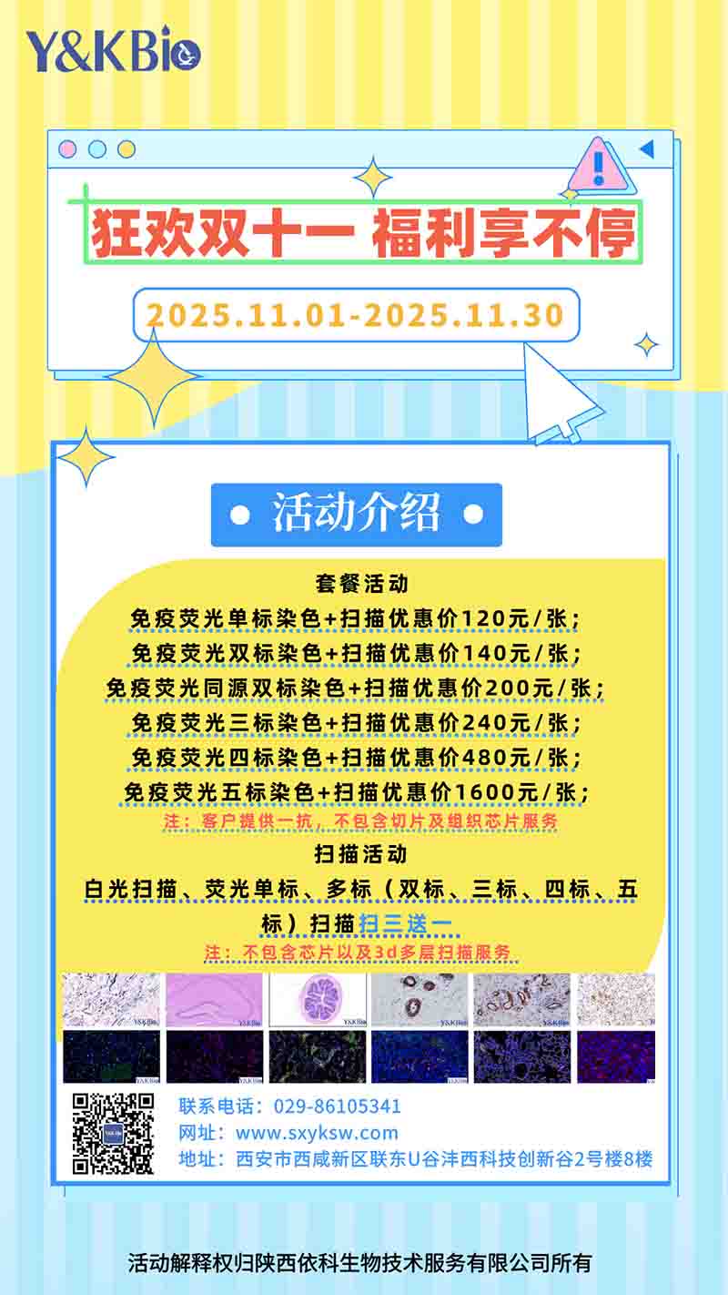 免疫荧光三标染色+扫描优惠价240元/张;免疫荧光四标染色+扫描优惠价480元/张;免疫荧光五标染色+扫描优惠价1600元/张;
