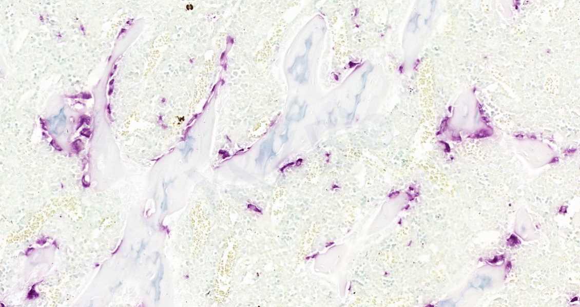 Trap染色是用于检测骨组织、骨细胞中特征物质的染色,使破骨细胞呈红色,背景呈绿色或蓝色。抗酒石酸酸性磷酸酶(Trap)为破骨细胞的标志酶,特异地分布于破骨细胞中,为破骨细胞所特有,通常作为鉴别破骨细胞的重要标志物。