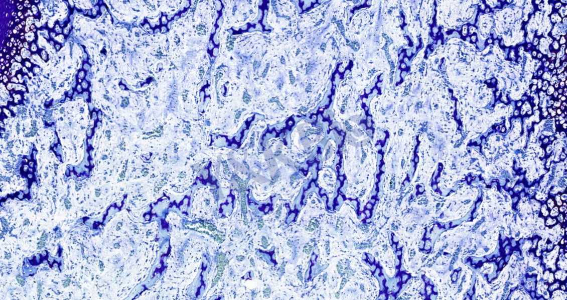 软骨基质对甲苯胺蓝的异染性,是因为软骨基质的主要成分是软骨黏蛋白、多糖物质,而酸性硫酸根与嗜碱性染料有亲和力。此法用于显示新生骨组织钙盐沉积,成骨细胞数目统计,观察软骨退变,软骨细胞坏死钙化,软骨基质裂隙,胶原纤维增生等病理改变。染色结果:软骨和成骨细胞呈蓝紫色,背景呈淡蓝色。