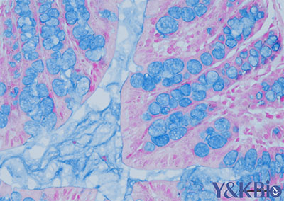 四、结果判读: 酸性黏蛋白(硫酸黏蛋白和唾液黏蛋白)为蓝色,蛋白多糖和透明质酸为蓝色,细胞核为红色。